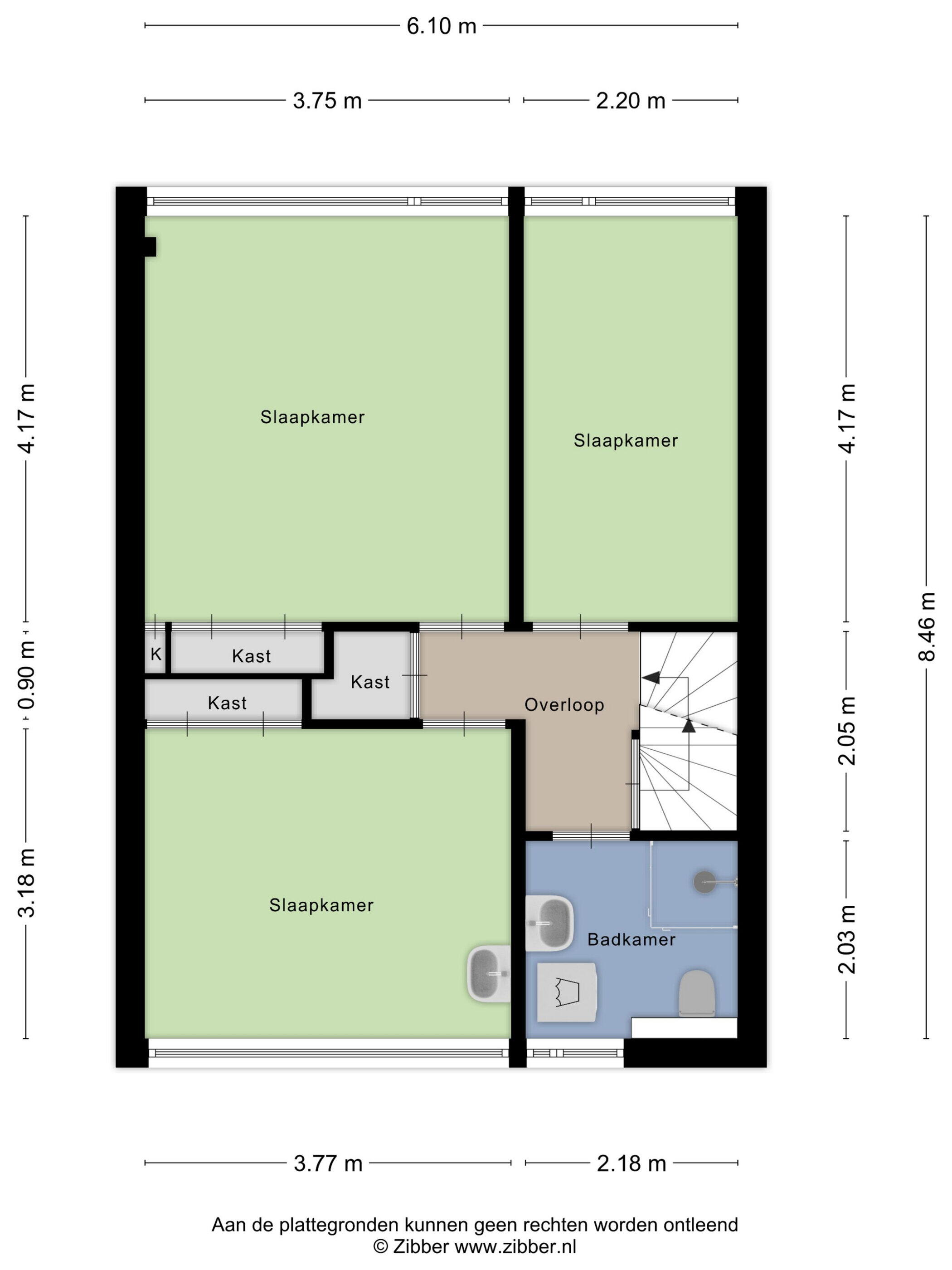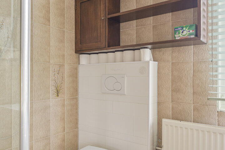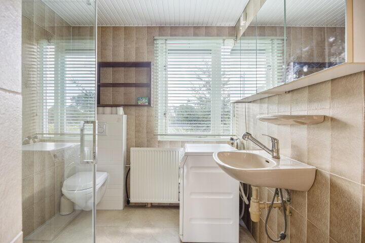 Op de eerste verdieping biedt de overloop toegang tot drie slaapkamers, waarvan twee slaapkamers met vaste kast en de badkamer met wastafel, radiator, toilet, douche en aansluiting droger/wasmachine.