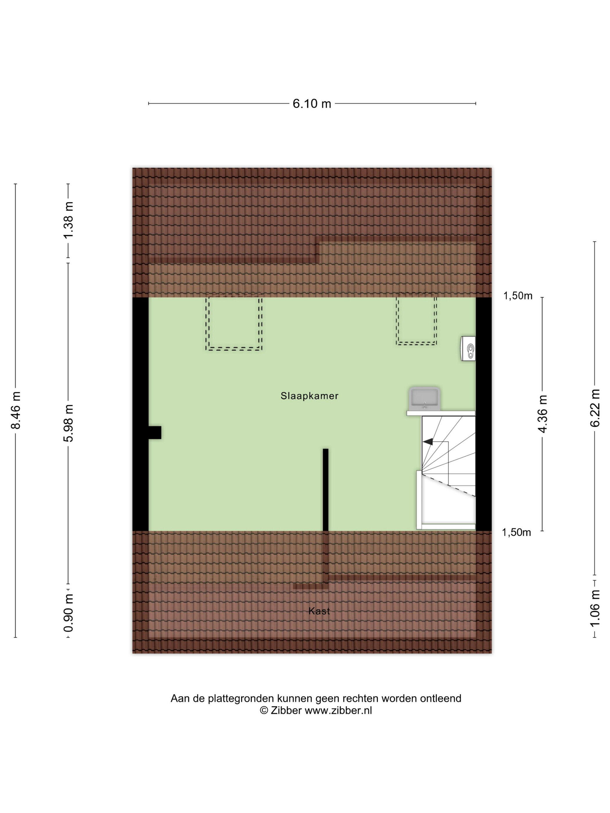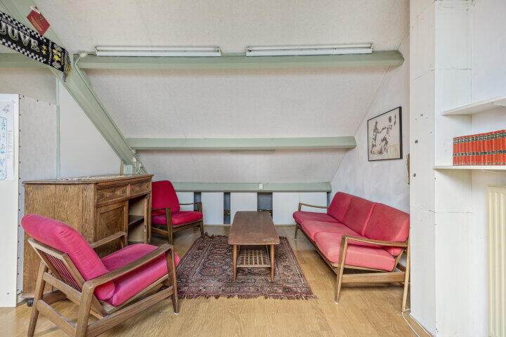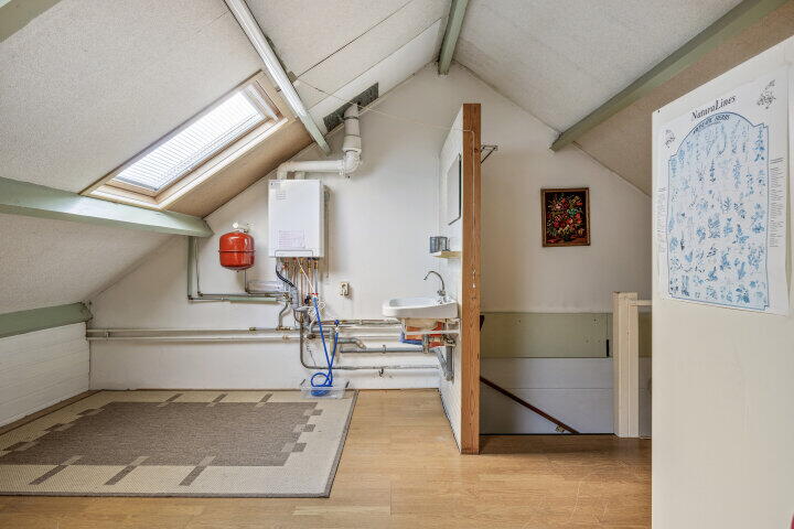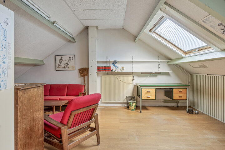 Overloop, 1 ruime slaapkamer met twee velux dakramen en bergruimte achter de knieschotten, wasbak en CV-opstelling (Remeha 2025).